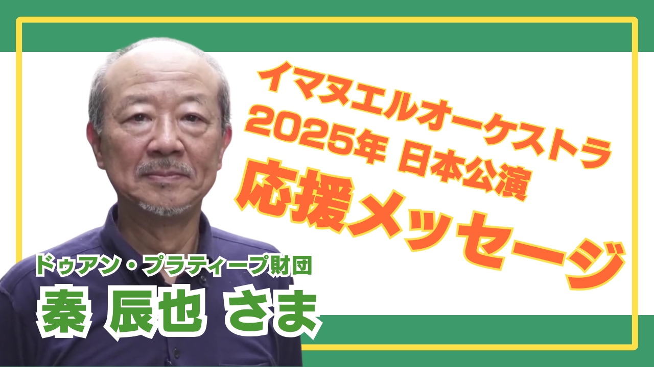 いつも温かいご支援とご関心を寄せていただき、誠にありがとうございます。私たちが進めている、タイ・クロントイスラムで活動する「イマヌエルオーケストラ」の子どもたちを日本に招くプロジェクト。その実現に向けて、クロントイで40年以上にわたり子どもたちを支え続けてこられた、ドゥアン・プラティープ財団の秦 辰也様より、心のこもった応援メッセージ動画を頂戴いたしました。