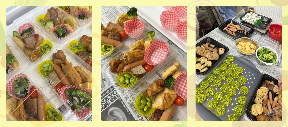この日は、インゲン豆、レンコンの天ぷら、ハンバーグ、ウインナー、卵焼き、トマト、ブロッコリー、唐揚げ、小松菜か炒め物などなど