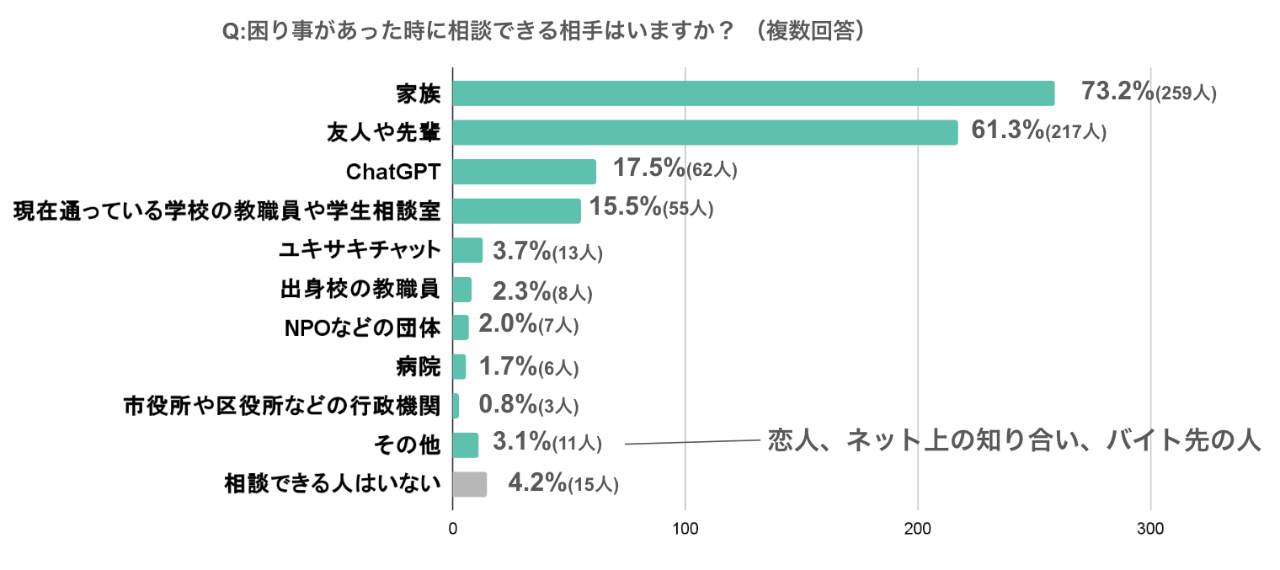 相談先がないと回答した方は4.2%でした。一方で、95.8%の方は平均1.89個の相談先を持っており、最も多かったのは「家族」、次いで「友人や先輩」、そして「ChatGPT」も3位に入りました。