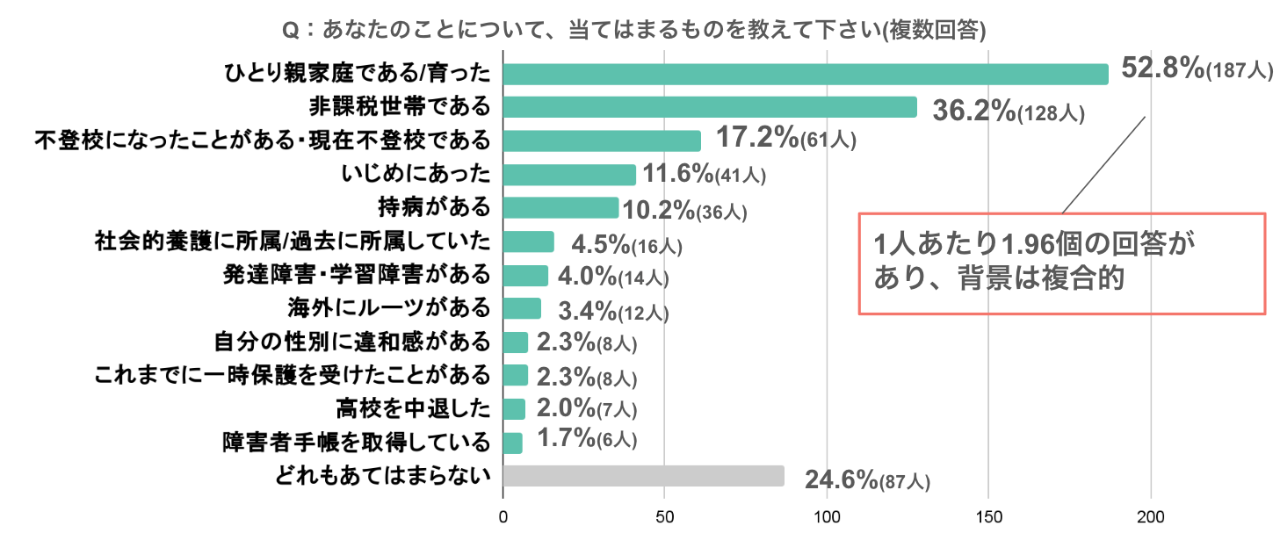 ひとり親家庭で育った方が半数以上を占めました。また、「どれもあてはまらない」と回答した方を除くと、応募者の4人に3人が、1人あたり平均1.96個の困難な背景事情を抱えていました。