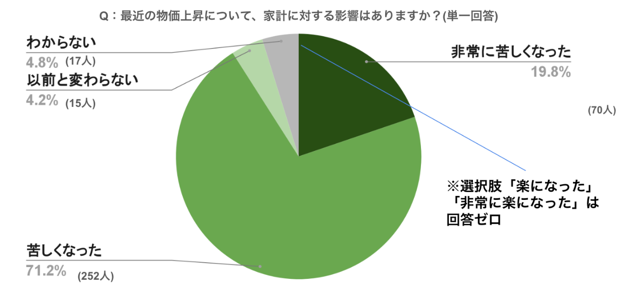 「非常に苦しくなった」が19.8%、「苦しくなった」が71.2%と、合わせて91%の方が物価上昇による生活への影響を感じていました。
