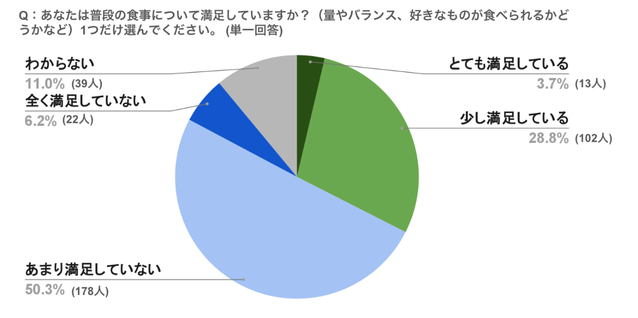 「満足していない」が56.5%、「満足している」は32.5%となり、半数を超える方が日々の食事に満足できていない状況です。