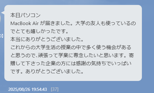 ・将来に不安がありましたが届けてくださったパソコンのお陰で前向きに取り組むことが出来、これから卒論に向けて使わせていただきます。