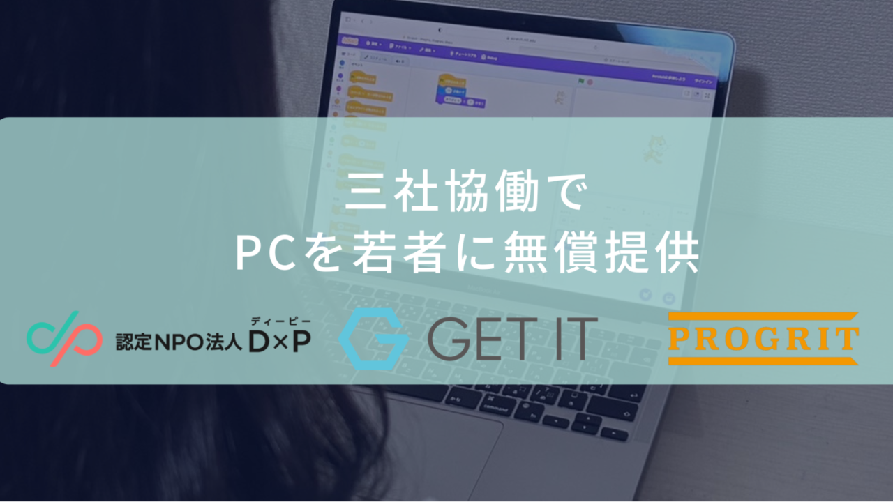 D×Pは、株式会社ゲットイットおよび株式会社プログリットから寄贈いただいたPC30台を、必要とする若者にお渡ししました。この取り組みは、経済的にしんどい・親に頼れない、不登校経験があるなど、さまざまな事情を抱えた若者が、パソコンを使う機会を通してこれからの選択肢や可能性を広げることを目的としています。