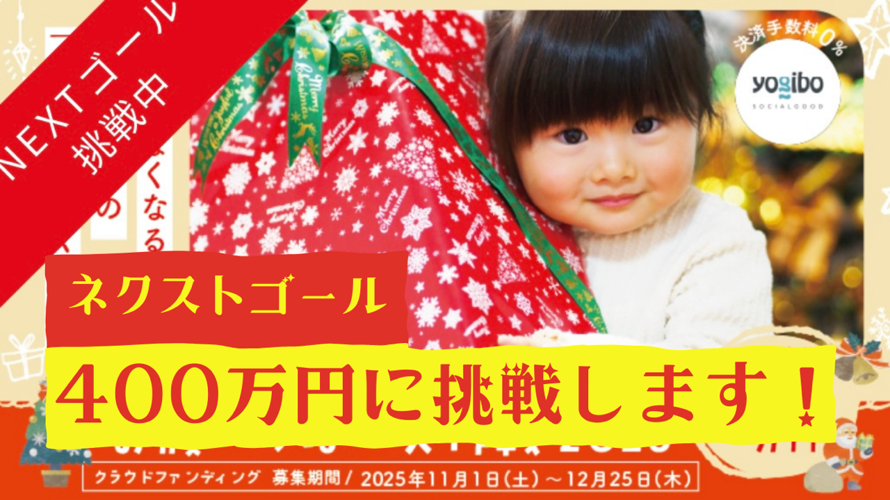 2025-12-26 15:05【🌟御礼🌟】クラファン終了しました!ご支援ありがとうございました!クラウドファンディングは、みなさまの応援に支えられ、おかげさまで目標金額200万円を達成することができました。 こどもたちを想う一人ひとりの小さなやさしさが集まって、あたたかい大きな力になりました。ネクストゴールへの挑戦も含め、最後まで見守っていただけたことに心より感謝しております。 事務局には早速、応援食品BOXを受け取られたご家庭より「届きました!」のメールやはがきが次々に届いています。ケーキキットで作ったケーキの写真や感想も添えられており、こどもたちとご家族が一緒に楽しいクリスマスを過ごされたようすが伝わってきて、スタッフみんなで嬉しく読ませていただいています。 ご家庭から届いたメッセージは、後日こちらの活動報告にてご紹介させていただく予定です。 あたたかいご支援、本当にありがとうございました。 集まった「想い」の循環を、引き続き見守ってくだされば嬉しいです。2025-12-26 15:05【🌟御礼🌟】クラファン終了しました!ご支援ありがとうございました!クラウドファンディングは、みなさまの応援に支えられ、おかげさまで目標金額200万円を達成することができました。 こどもたちを想う一人ひとりの小さなやさしさが集まって、あたたかい大きな力になりました。ネクストゴールへの挑戦も含め、最後まで見守っていただけたことに心より感謝しております。 事務局には早速、応援食品BOXを受け取られたご家庭より「届きました!」のメールやはがきが次々に届いています。ケーキキットで作ったケーキの写真や感想も添えられており、こどもたちとご家族が一緒に楽しいクリスマスを過ごされたようすが伝わってきて、スタッフみんなで嬉しく読ませていただいています。 ご家庭から届いたメッセージは、後日こちらの活動報告にてご紹介させていただく予定です。 あたたかいご支援、本当にありがとうございました。 集まった「想い」の循環を、引き続き見守ってくだされば嬉しいです。