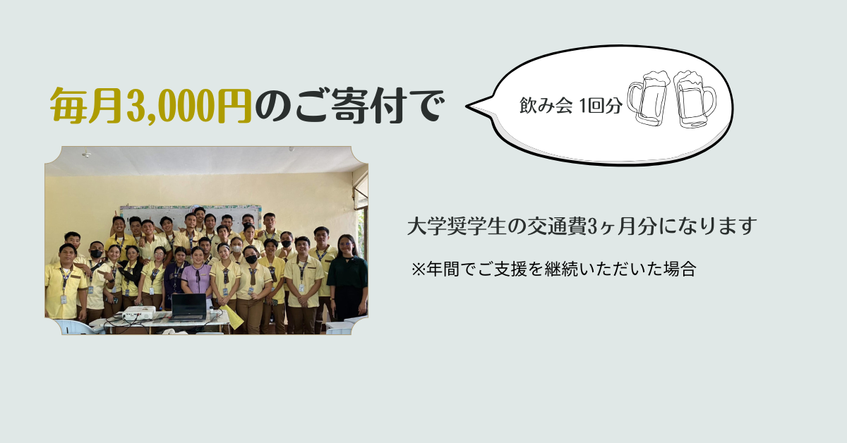 ※一部高校生も支援:フィリピンの高校は大学の中にあるケースもあります。近い場所にある中学と違って交通費もかかり、教材費も高くなる傾向があり、高校生も対象としています。