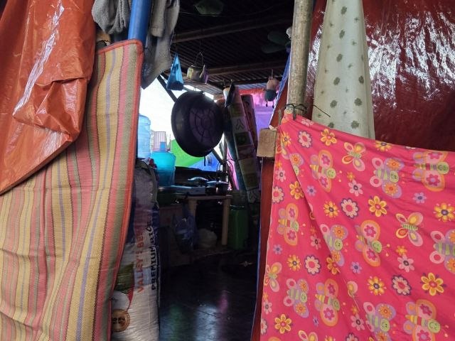 現地NGOTSKではドゥムログ村の村長さんのご厚意で、プライベートスペースの中の家畜飼育場所などを取り壊し、ベニヤ板などをしき、ブルーシートや布でしきりを作った簡易的な仮住まいを増設し、体育館や学校などに避難していた人々が移転してきています。