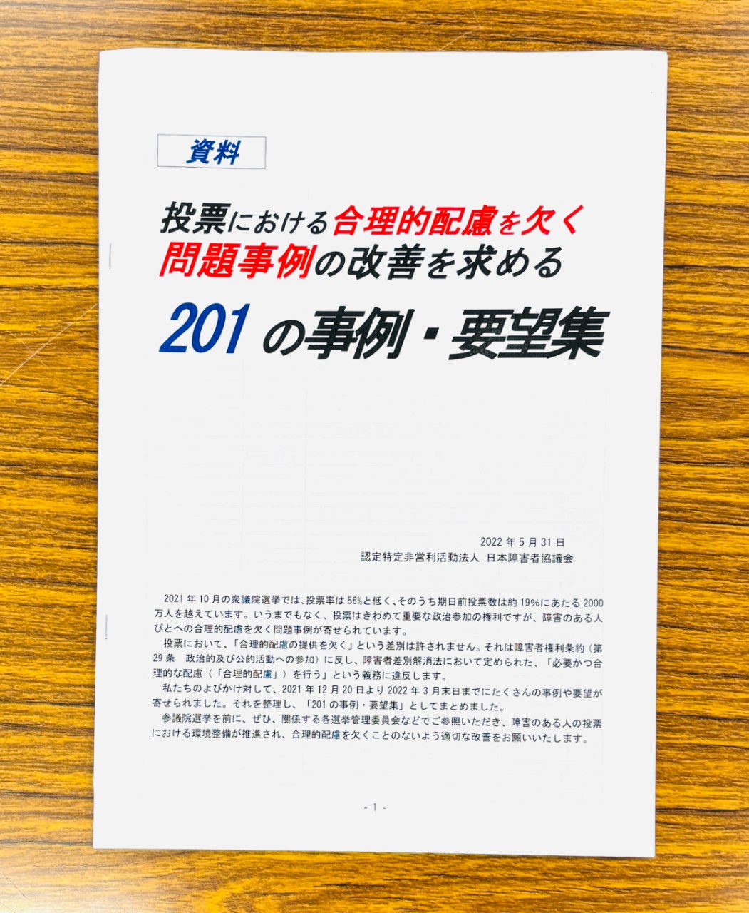 そこでJDは、障害のある人が投票をする上でどのような障壁(バリア)があるのか、当事者のみなさんに困りごとや要望事項をお伺いしました。そうして集まった201件の要望を、総務省に伝えて改善を呼びかける運動を行ないました。