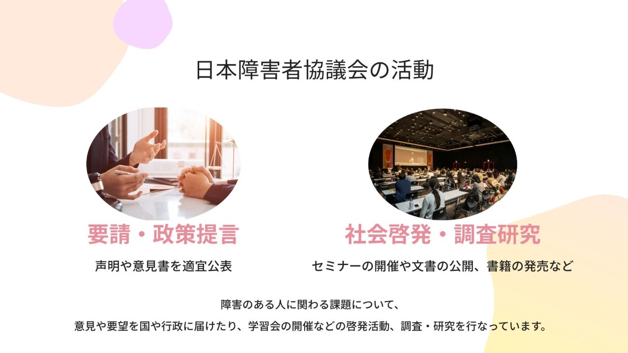 障害のある人に関わる課題について、意見や要望を国や行政に届けたり、学習会の開催などの啓発活動、調査・研究を行なっています。