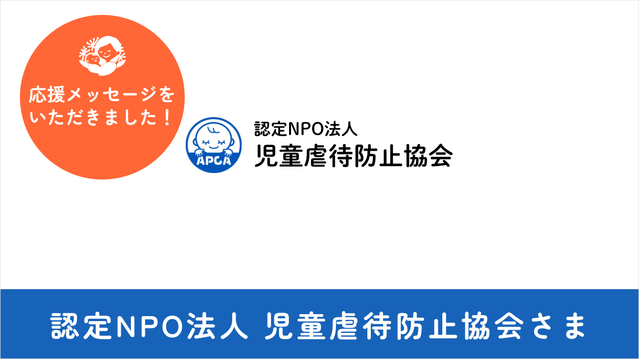 2024-11-03 00:42【応援メッセージをいただきました】認定NPO法人 児童虐待防止協会さま1990年日本で初めて児童虐待を防止するために創設された民間の団体「認定NPO法人 児童虐待防止協会さま」より応援メッセージをいただきました。2024-11-03 00:42【応援メッセージをいただきました】認定NPO法人 児童虐待防止協会さま1990年日本で初めて児童虐待を防止するために創設された民間の団体「認定NPO法人 児童虐待防止協会さま」より応援メッセージをいただきました。