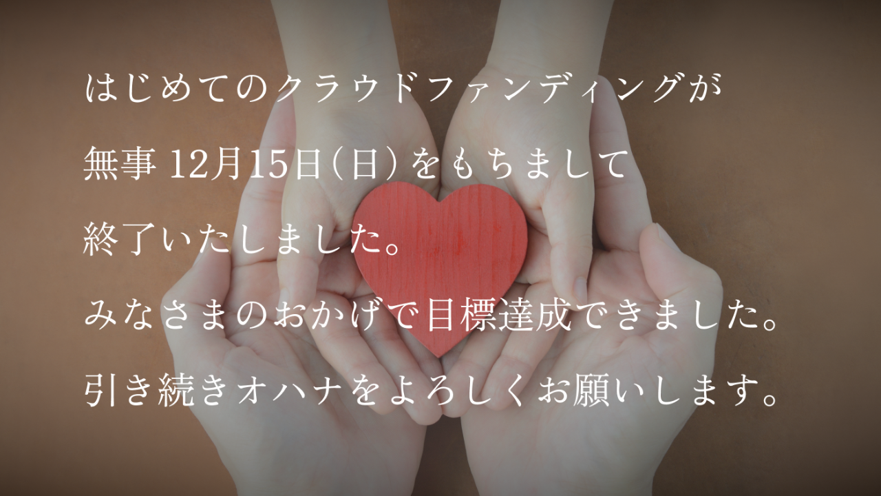 2024-12-16 13:37【クラウドファンディングのお礼】10月15日(火) よりスタートしましたNPO法人O'hanaのクラウドファンディング。 無事 12月15日(日)をもちまして終了いたしました。2024-12-16 13:37【クラウドファンディングのお礼】10月15日(火) よりスタートしましたNPO法人O'hanaのクラウドファンディング。 無事 12月15日(日)をもちまして終了いたしました。