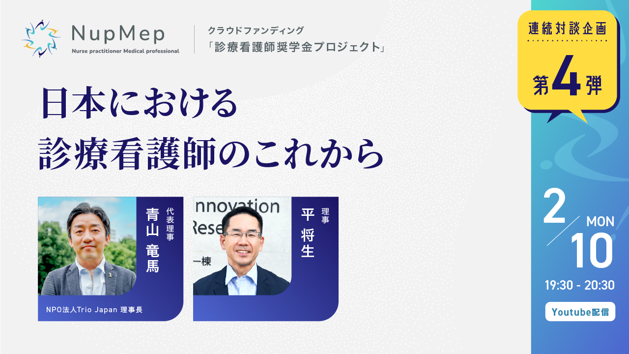 2025-01-30 18:00💬2/10実施 第4回対談企画のご案内診療看護師奨学金プロジェクトを応援くださり、いつもありがとうございます! クラウドファンディング告知のため、この度NupMepでは連続対談企画を全4回開催します。 最終回となる第4回は「日本における診療看護師のこれから」をテーマに、2/10(月)19:30より、弊団体代表理事 青山と理事 平の2名による対談企画をお届けします。2025-01-30 18:00💬2/10実施 第4回対談企画のご案内診療看護師奨学金プロジェクトを応援くださり、いつもありがとうございます! クラウドファンディング告知のため、この度NupMepでは連続対談企画を全4回開催します。 最終回となる第4回は「日本における診療看護師のこれから」をテーマに、2/10(月)19:30より、弊団体代表理事 青山と理事 平の2名による対談企画をお届けします。