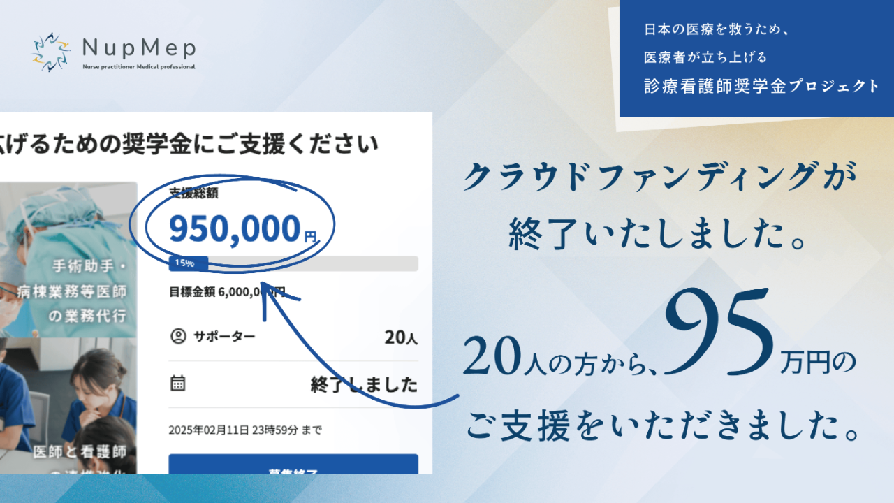 2024-12-16 18:00💪診療看護師奨学金プロジェクトで実現したいことクラウドファンディング「診療看護師奨学金プロジェクト」は、日本における医療現場の課題解決のために始まりました。今回は、クラウドファンディングを通じて、私たちNupMepが実現したいことをご紹介いたします。2024-12-16 18:00💪診療看護師奨学金プロジェクトで実現したいことクラウドファンディング「診療看護師奨学金プロジェクト」は、日本における医療現場の課題解決のために始まりました。今回は、クラウドファンディングを通じて、私たちNupMepが実現したいことをご紹介いたします。
