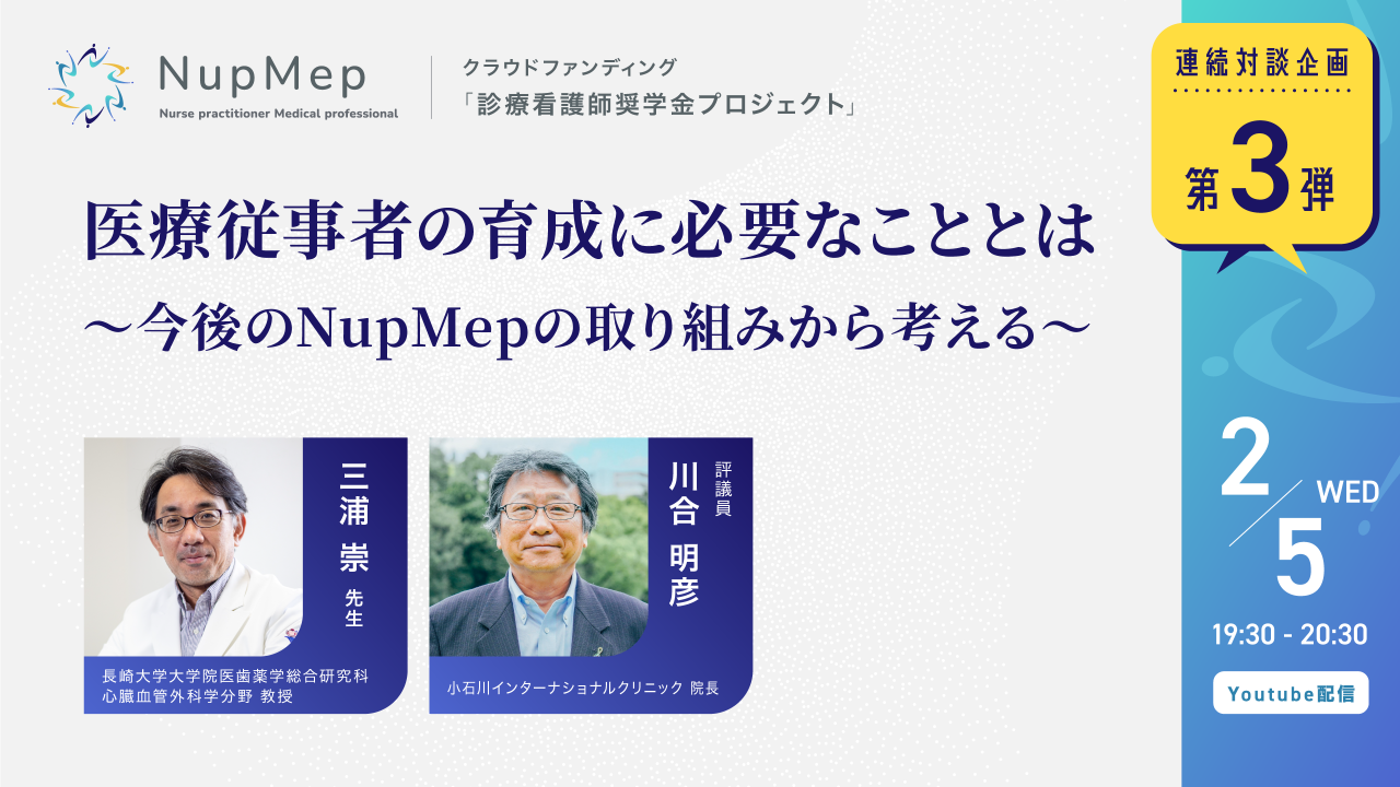 2025-02-10 19:41【第3弾対談アーカイブ】医療従事者の育成に必要なことは〜今後のNupMepの取り組みから考える〜クラウドファンディング特別企画として、ライブ配信第3回目を行いました。 この度、一般財団法人診療看護師等医療従事者育成支援協会のYouTubeライブ配信を開催いたしました。 今回の対談企画では、長崎大学大学院教授の三浦崇先生とNupMepの川合評議員が登壇し、日本の医療現場における診療看護師(ナースプラクティショナー/NP)制度の現状と課題について議論しました。2025-02-10 19:41【第3弾対談アーカイブ】医療従事者の育成に必要なことは〜今後のNupMepの取り組みから考える〜クラウドファンディング特別企画として、ライブ配信第3回目を行いました。 この度、一般財団法人診療看護師等医療従事者育成支援協会のYouTubeライブ配信を開催いたしました。 今回の対談企画では、長崎大学大学院教授の三浦崇先生とNupMepの川合評議員が登壇し、日本の医療現場における診療看護師(ナースプラクティショナー/NP)制度の現状と課題について議論しました。