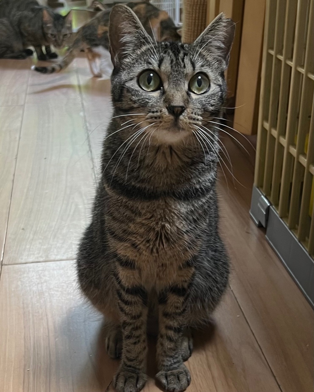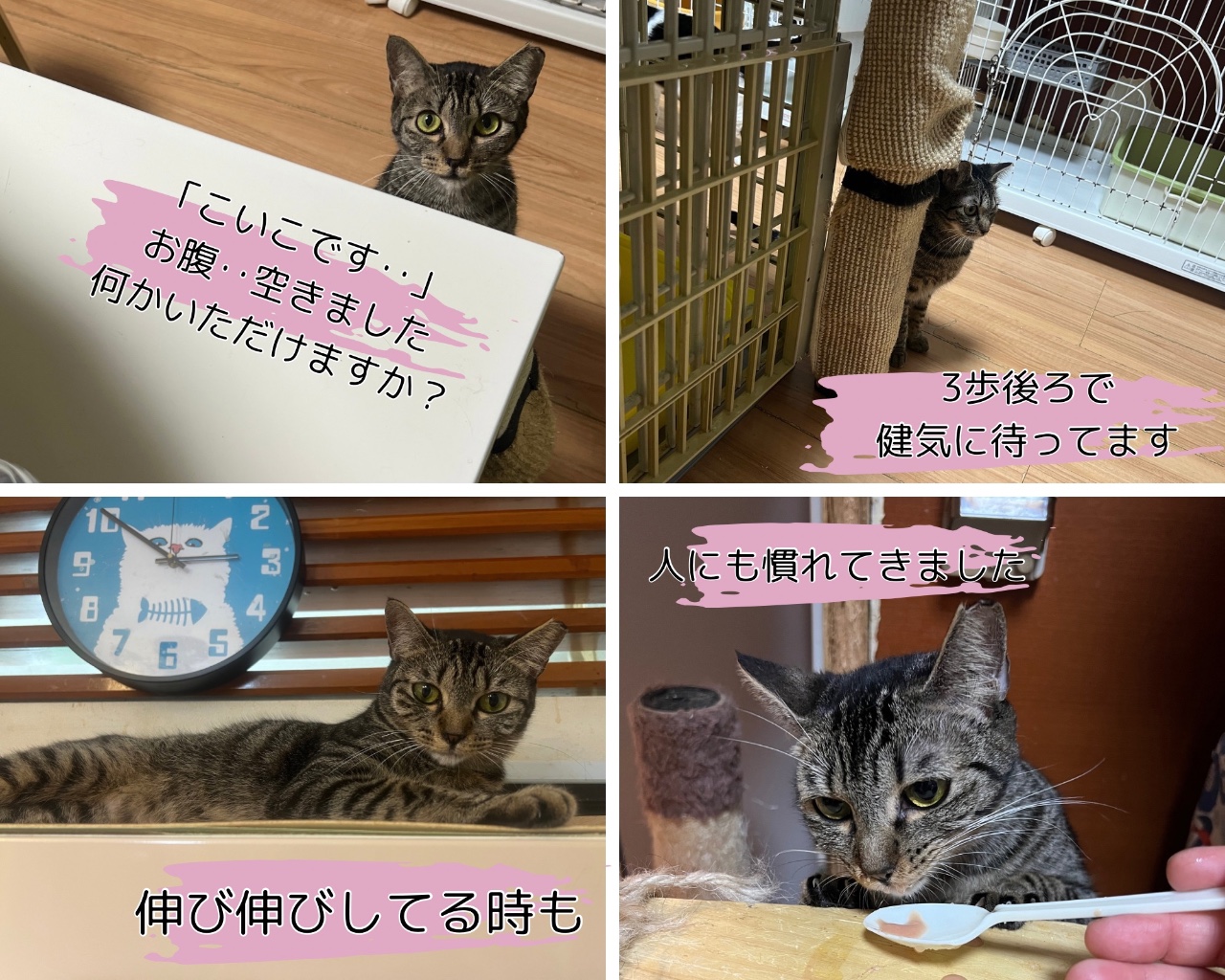 最近は、窓際で日向ぼっこしたり‥みんなが美味しそうなものを食べてると様子を見に来たり、指の匂いを嗅いで挨拶出来たりと保護当時に比べるとだいぶ人との距離に慣れてきました。
