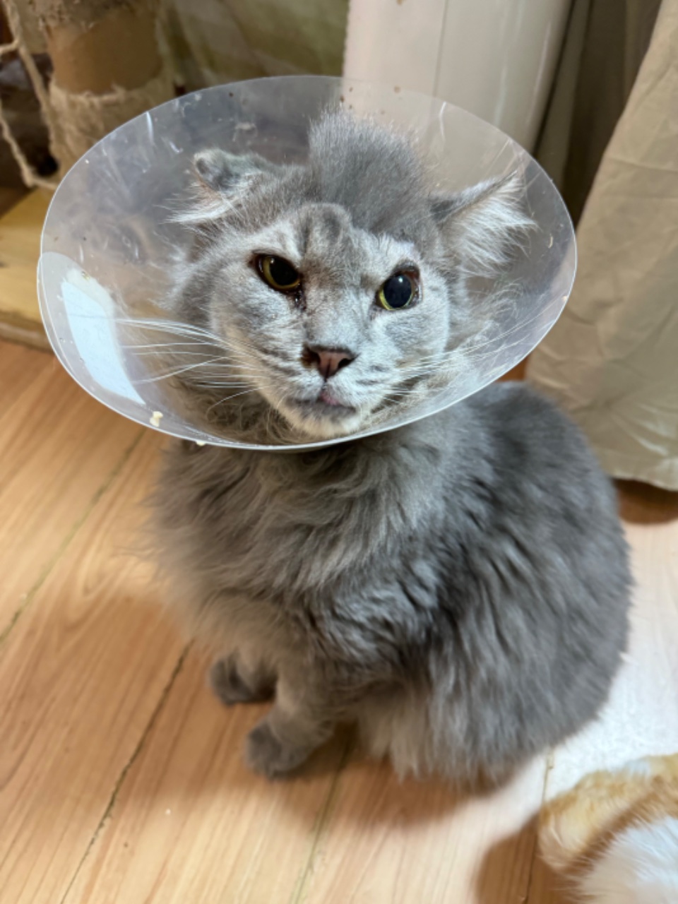 保護当初は頭に穴があいており、とても痛々しい状況でした( ; ; )傷口を守るために、帽子を被っていたのでターバンアタロー君となりました。現在は、頭を触らないように注意し、傷口も安定しています。以前は3ヶ月周期で、穴が再発していました。頭のモヒカンは、皮膚移植をしてターバンアタロー君が治療を頑張っている証です。