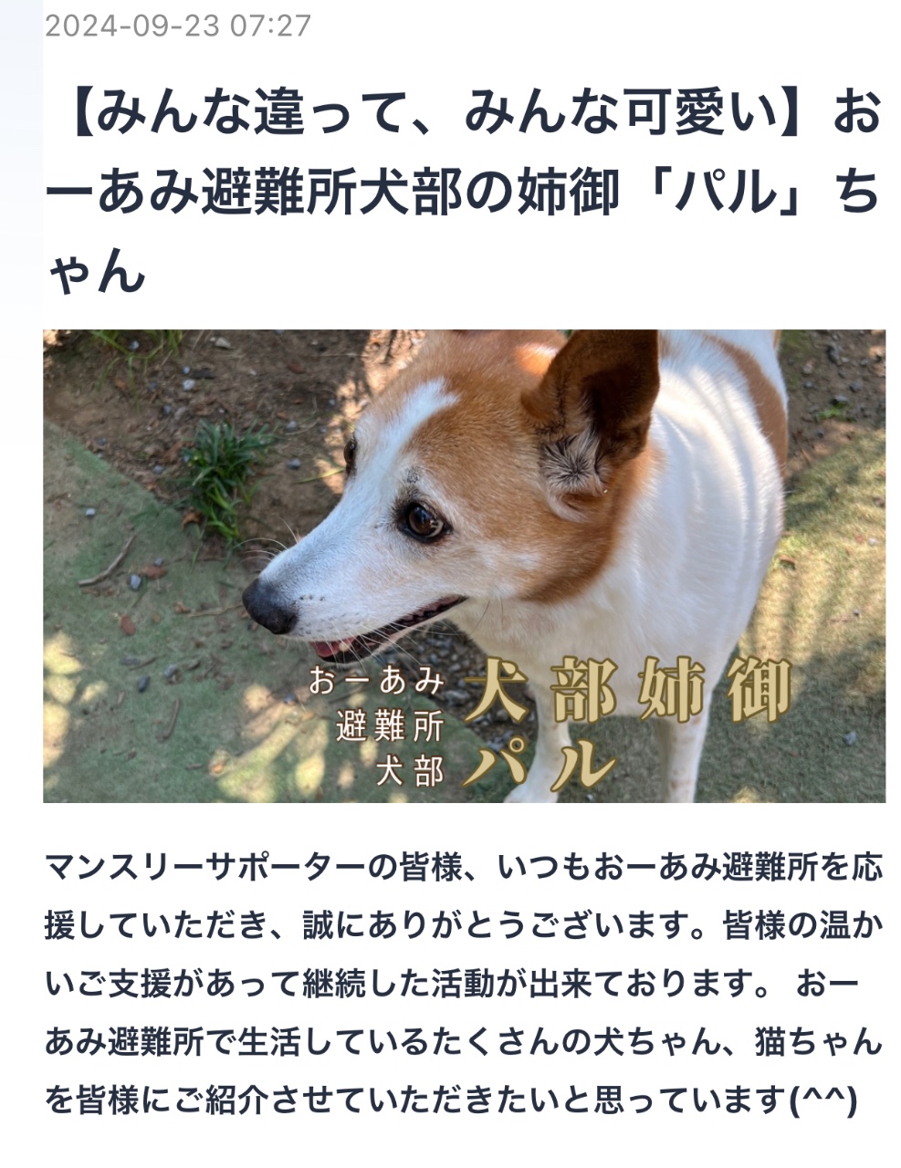 マンスリーサポーターの皆様、いつもおーあみ避難所を応援していただき、誠にありがとうございます。
