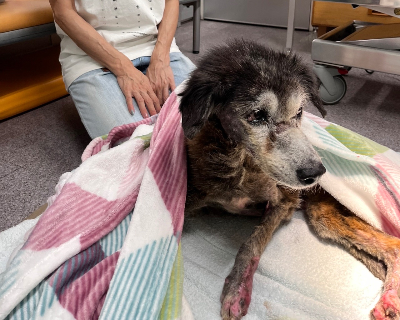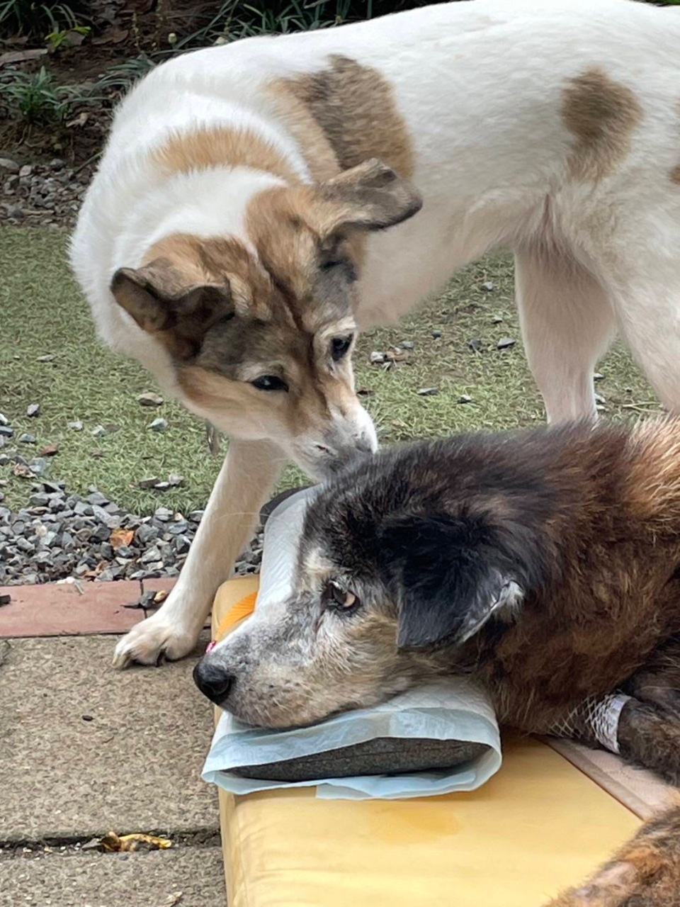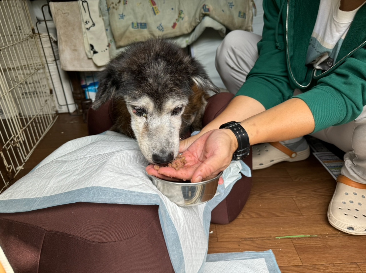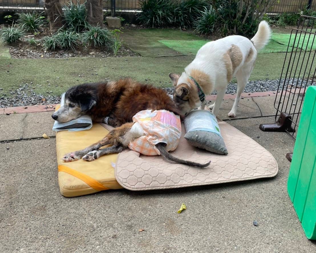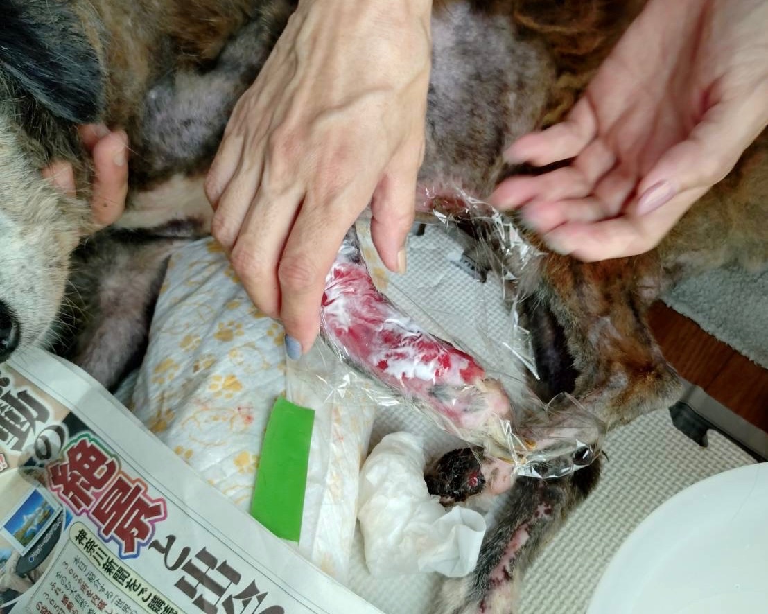 両腰(人間で言うお尻の横の部分)にかなり酷い褥瘡があり、褥瘡部分も上記同様の手当てをして、パットで保護するというケアを主に毎日リーダーや犬お当番のボランティアさんが交代でケアをしていました。