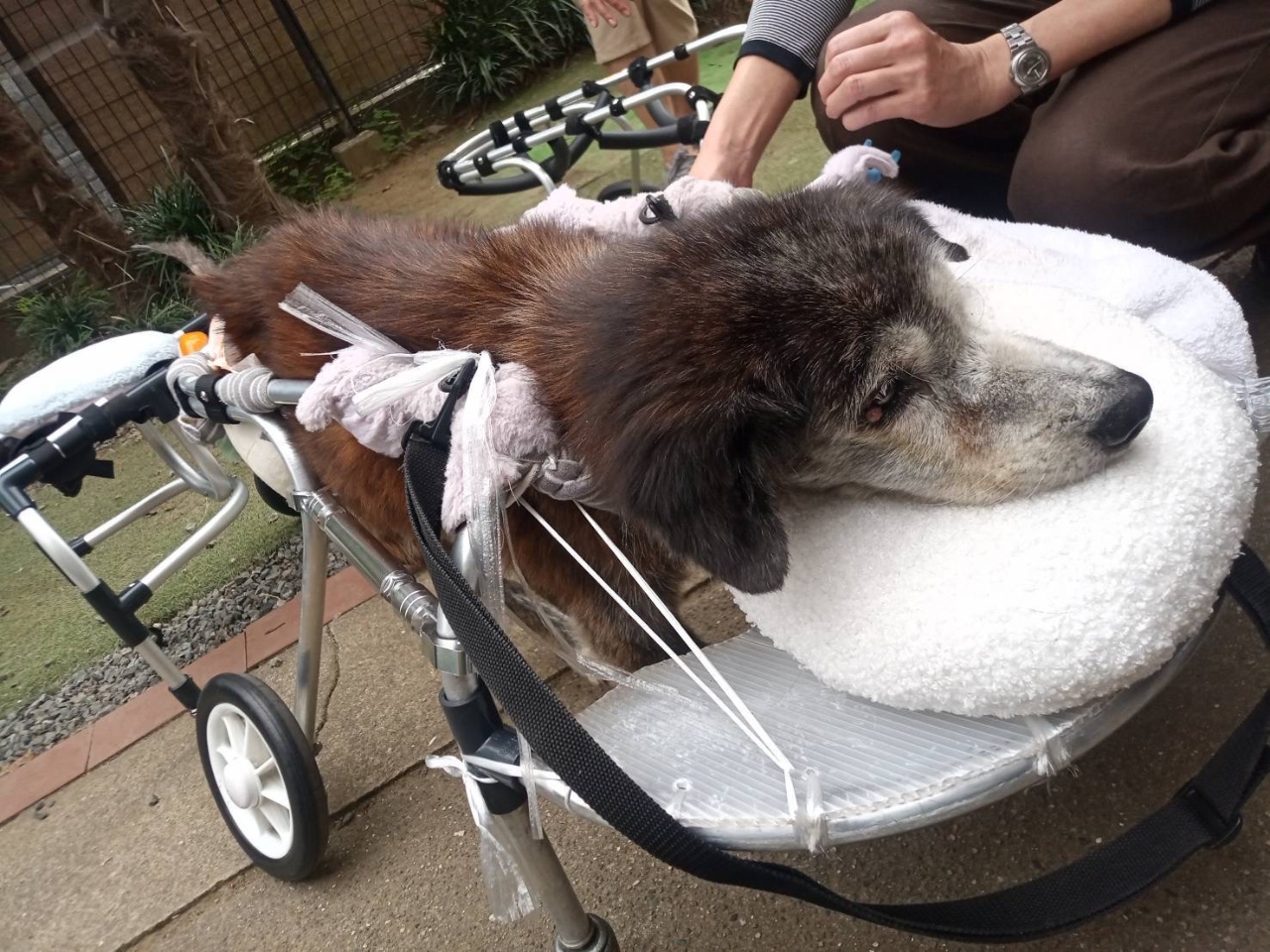右後ろ足が動かず、ナックリングしてしまうのでボランティアさんがフォローしながら、自分で歩く!!と頑張ってます。