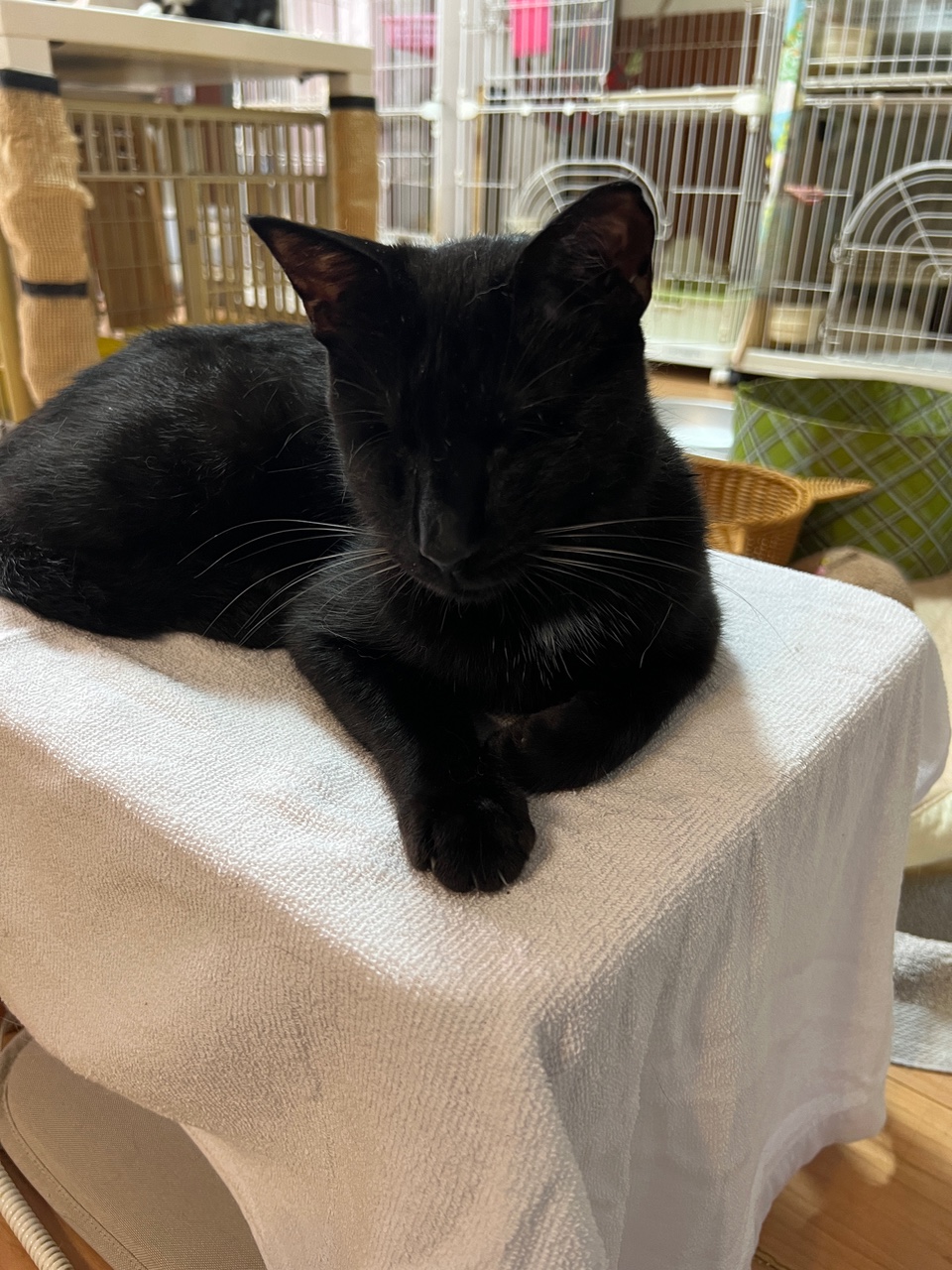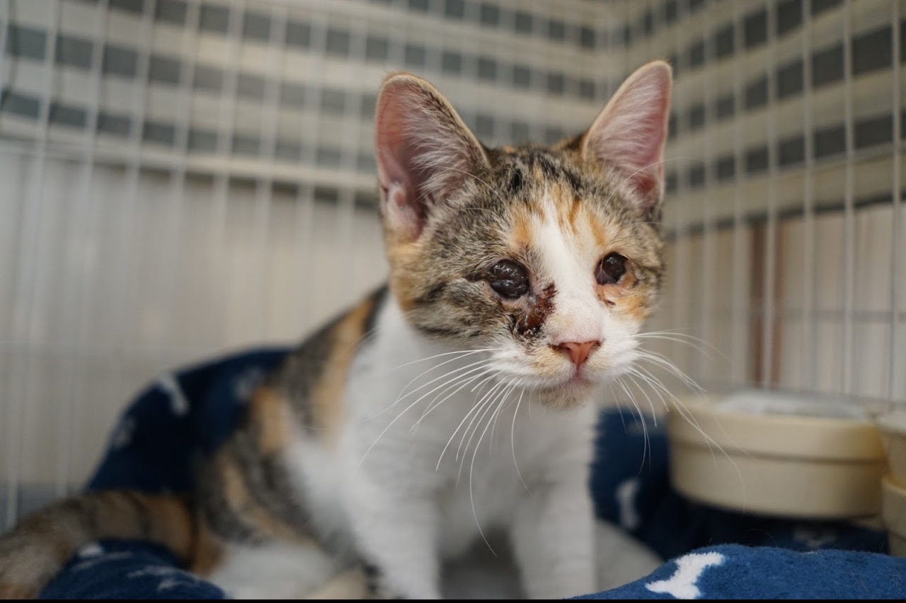 沖縄県出身の子猫で、猫白血病キャリアで目は両方見えておらず改善する可能性もないとの事。本人はまったく気にせず、来た当初は小さい身体でケージを忍者のように壁をよじ登って、上下移動していました。人慣れもして、無邪気に人の手で遊んでる姿はとっても可愛いです(〃▽〃)