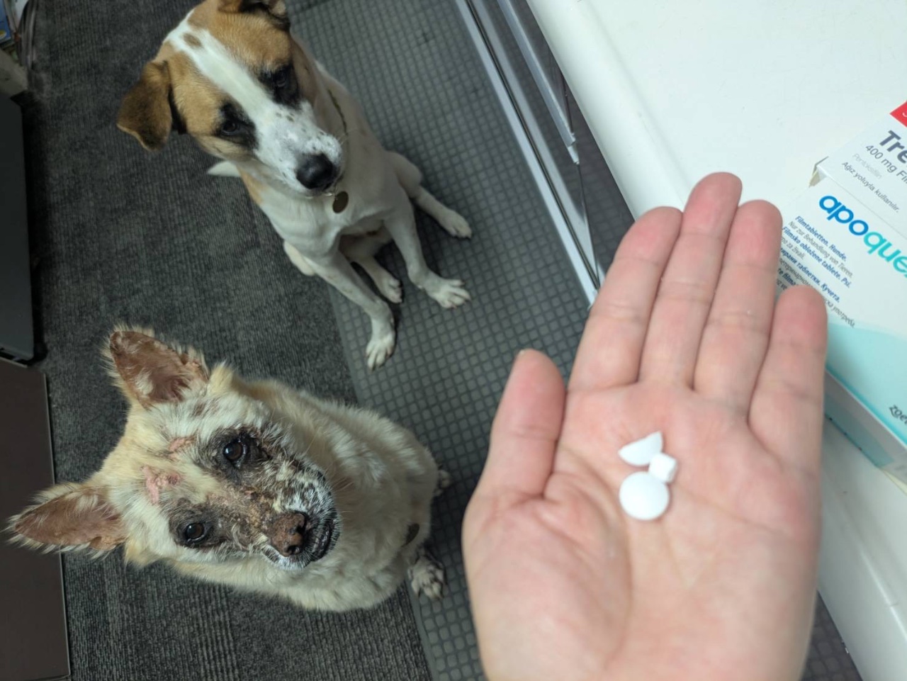 今は獣医師さんからの減薬の指示があり、今の服用量は、アポキル16を朝半錠、夜半錠。トレンタール(ペントキシフィリンのジェネリック)を朝1錠半、夜1錠半と以前より減薬しています。