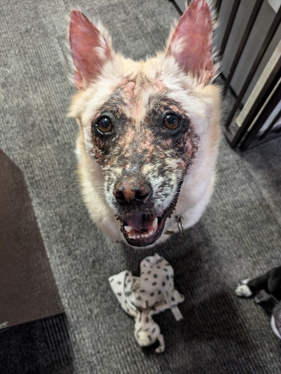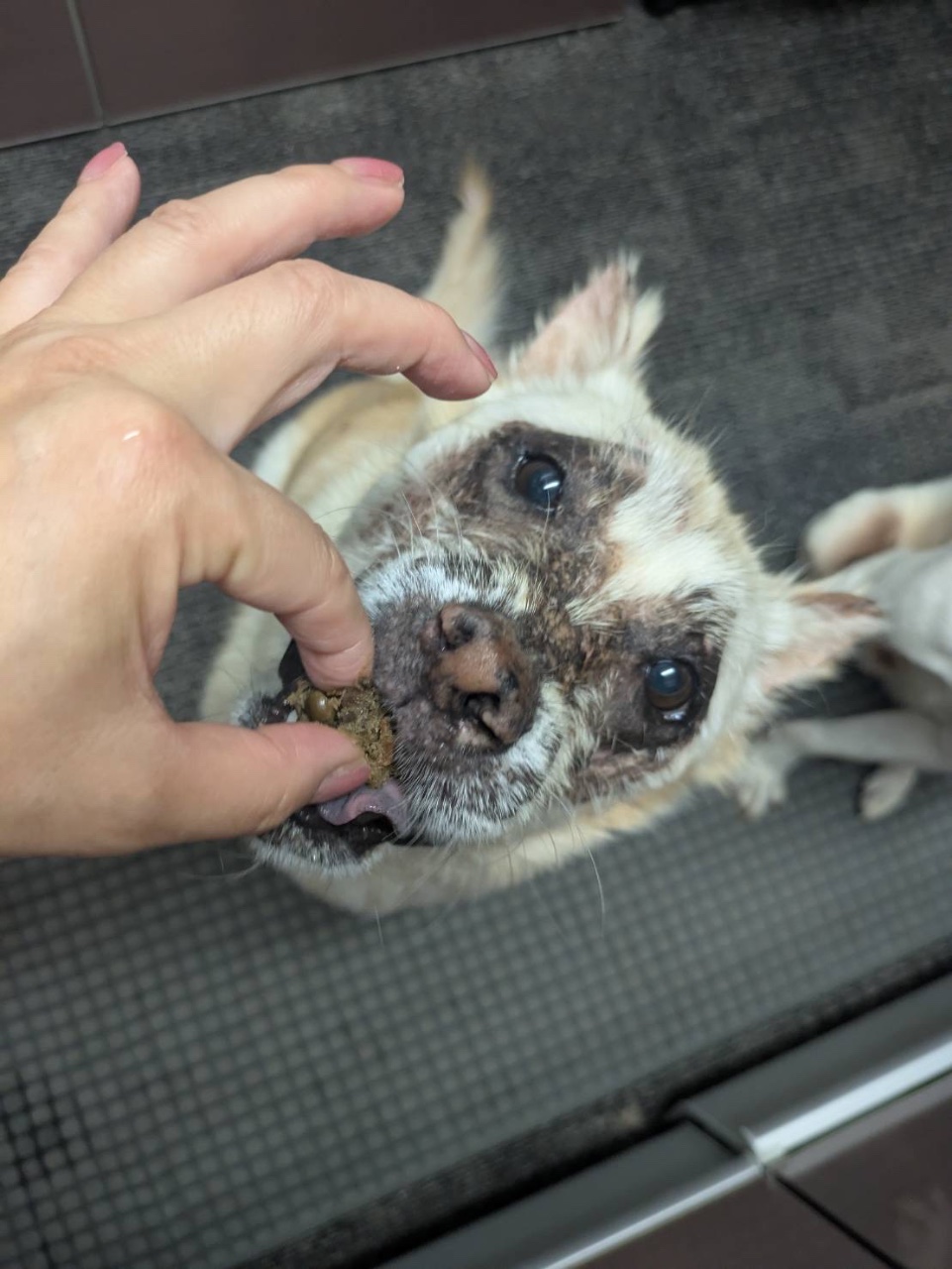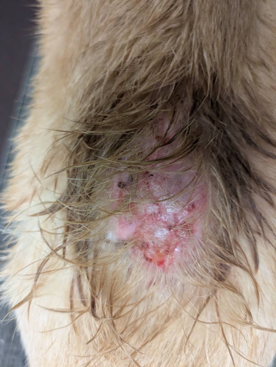 フェイフェイの虚血性皮膚症の症状で、薬が切れると痒みや皮膚がつっぱってしまい、舐め壊しが始まるとあっという間にじゅくっとします。