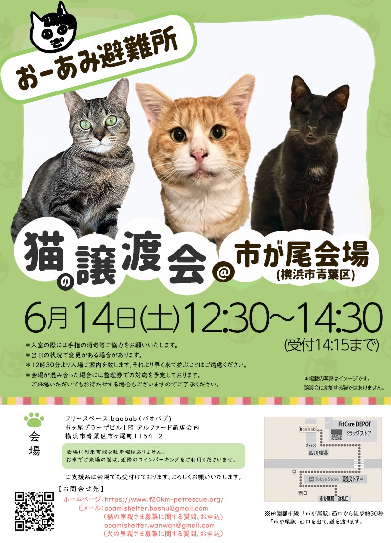 次回の保護猫の譲渡会は 6月14日(土)横浜市青葉区市ヶ尾会場です。