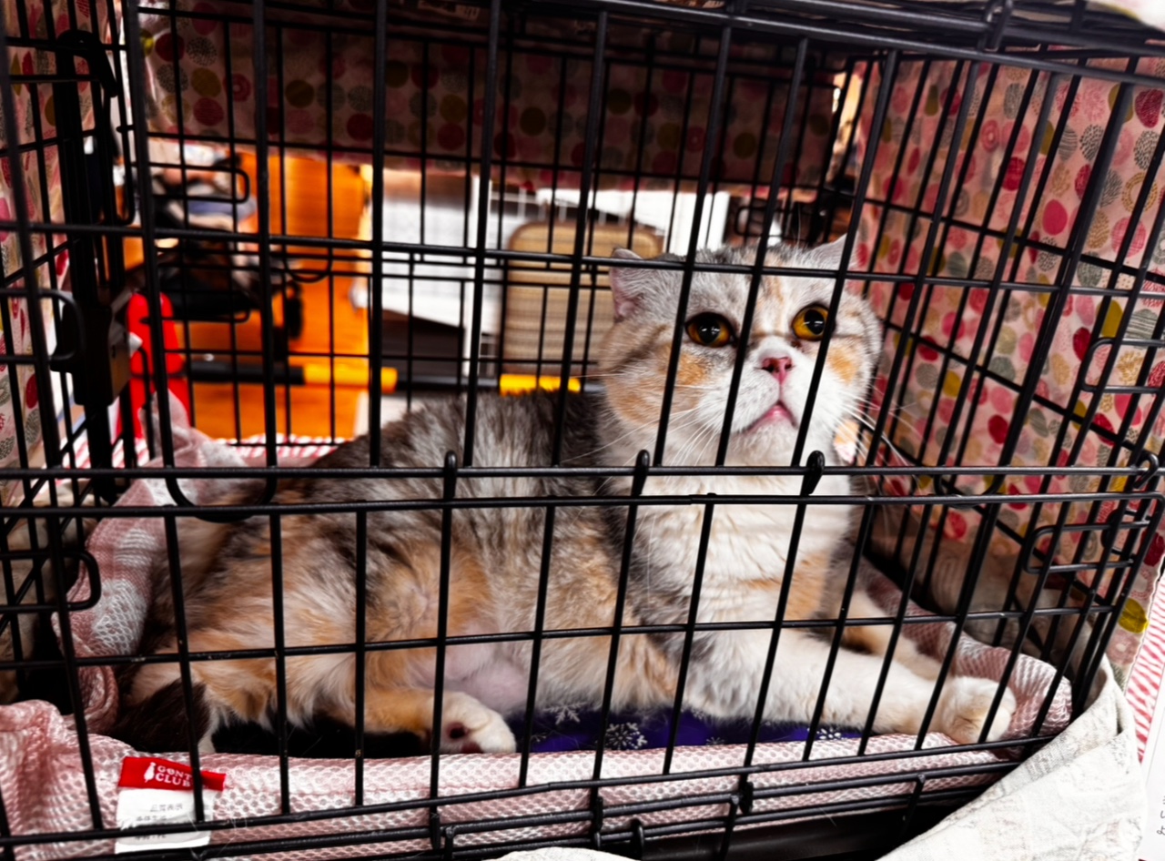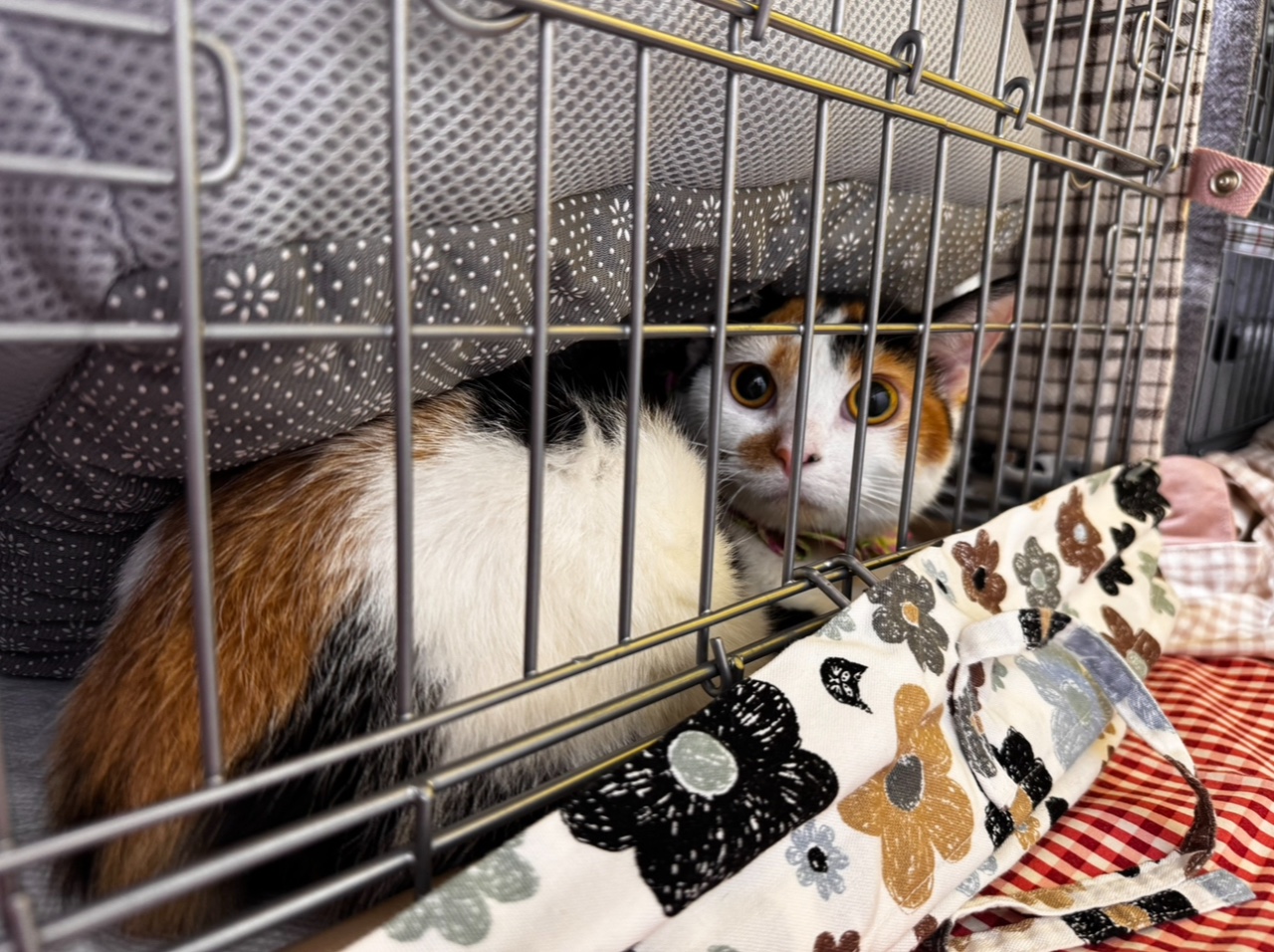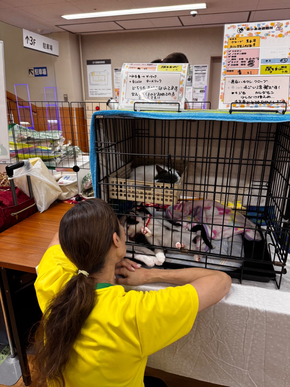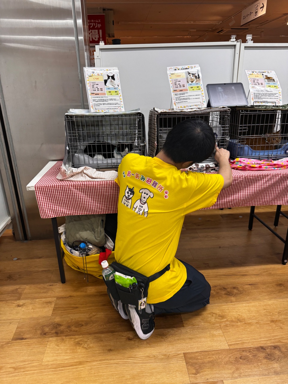 つばめちゃんのためにお預かりさんは譲渡会中にやさしく声がけしてフォロー中。