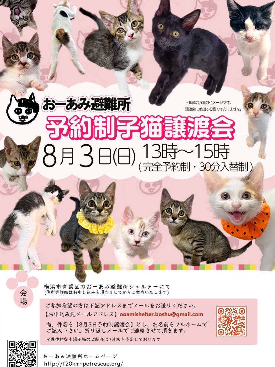 8月3日(日)おーあみ避難所シェルターにて予約制子猫譲渡会を開催します。