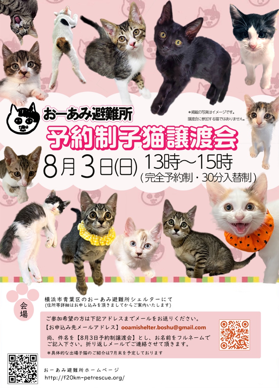 8/3(日)おーあみ避難所シェルターにて予約制子猫譲渡会が行われました。