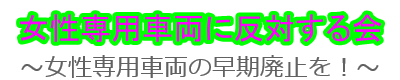 「女性専用車両に反対する会」(以下、当会)は女性専用車両が性差別や偏見(ジェンダーバイアス)を助長しており、多様性が重視される現代社会の流れに逆行した誤ったものであることを、より多くの人達に知ってもらいつつ、どの車両であっても性別を問わず男女とも平等に乗車サービスを受けられる本来の公共交通機関のあるべき状態を取り戻すために、2003年より女性専用車両をなくす活動をしている任意団体です。
