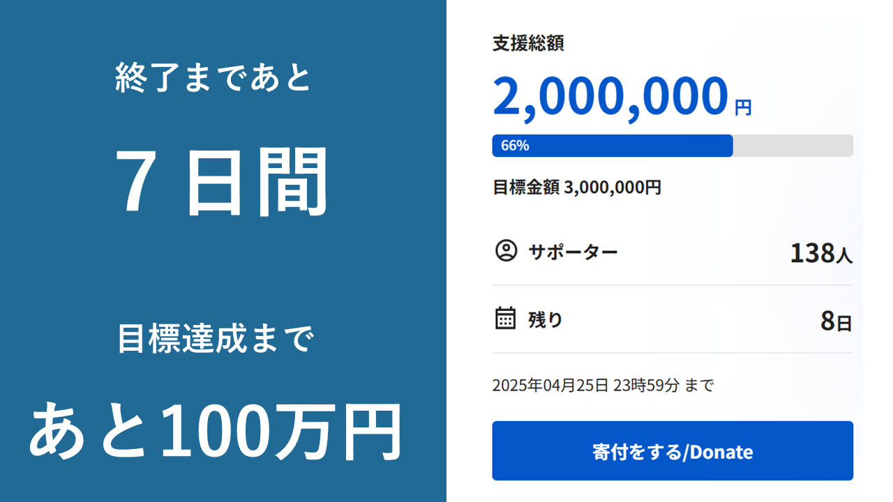 With just 7 days left, we are now JPY 1,000,000 away from our JPY 3,000,000 goal. On behalf of all our staff and partners, we sincerely thank you for your warm support and encouragement.