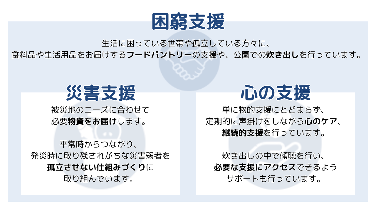 明日への一歩を踏み出すために誰かに「助けて」と言える、そしてできる誰かが手を差し伸べる、そんな優しさと憐みに満ちた社会の実現を目指し活動を続けていきます。