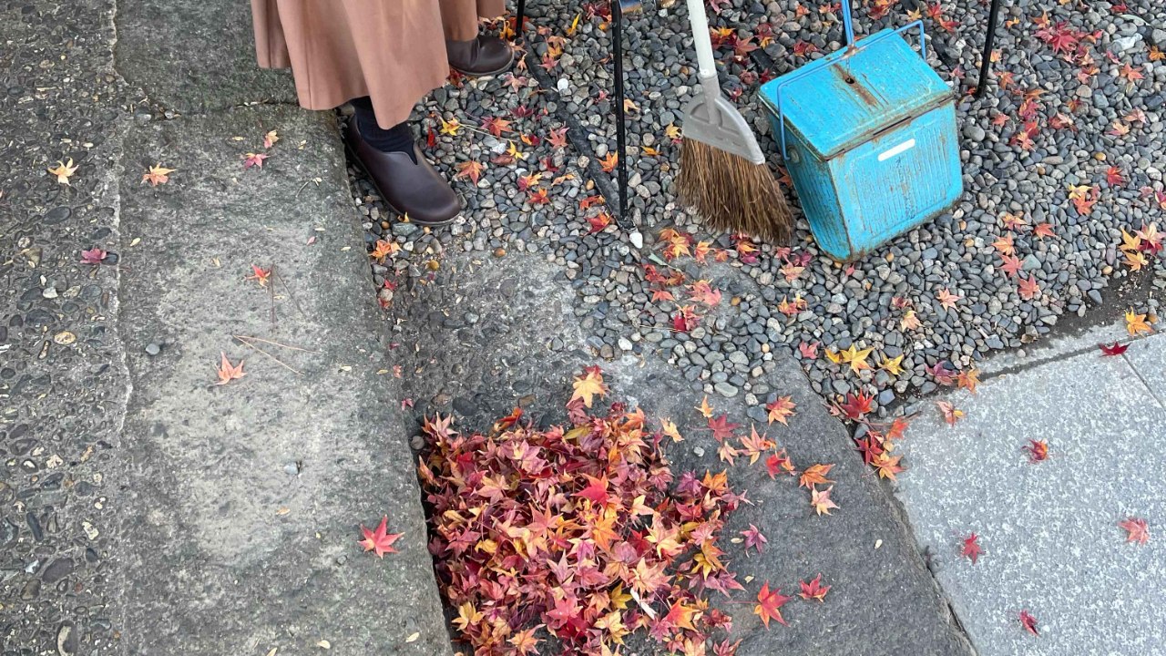 お客様をお迎えする準備として、朝の掃除は欠かせません。 冬の今シーズンは、スタッフ総出で落ち葉拾いがメインです。 落ち葉を踏んで滑らないようにと、おもてなしの心で掃除をしています。