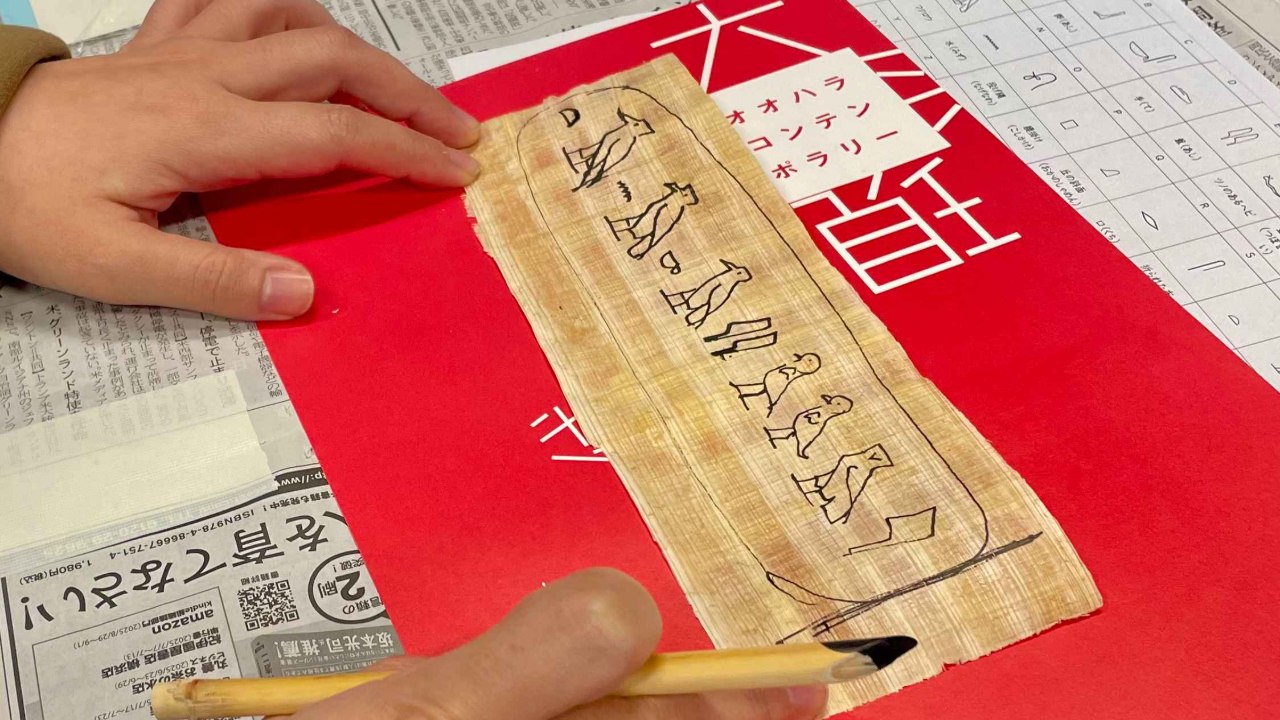 ヒエログリフで新年の書初め体験!倉敷考古館・山花京子館長と一緒に、古代エジプトのヒエログリフ文字を体験しました。五十音表を見ながら自分の名前をヒエログリフで書き、パピルス紙と葦ペンで本番に挑戦。気づけばヒエログリフの沼にハマる参加者も…!