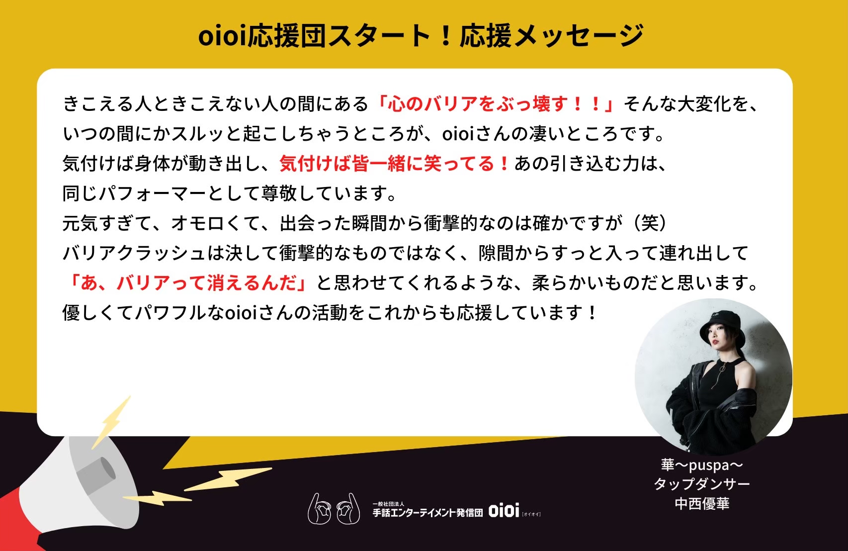 私たち、手話エンターテイメント発信団oioi(オイオイ)は、“きこえる人”と“きこえない人”の間にある心のバリアを壊し、一緒にオモシロがれる社会を創ることを目指しています。私たちと共に”バリアクラッシュ”していただけるオイオイ応援団員(継続的な月額寄付をしてくださる方)を募集しています。2016年4月1日法人設立 ★ホームページ:https://www.oioi-sign.com/ ★