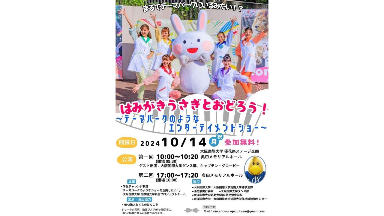 はみがきうさぎと踊ろう🐰🧡 テーマパークのようなエンターテイメントショーが 大阪国際大学優花祭(ゆうかさい)で開催されます🎹🎶 どなたでも参加無料❗️ 第一部10:00〜10:20にはダンス部の学生さんと大学のキャラクター キャプテン・グロービーくんがゲスト出演いたします🦅✨ 第二部は17:00〜17:20です🎤🕺 ぜひお気軽にご来場ください!お待ちしております😊