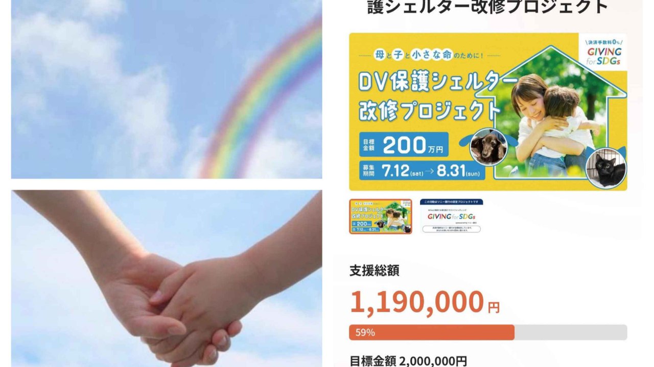 「母と子と小さな命のために」 ペットも一緒に避難できる希少なDV保護シェルターを守りたい。目標金額200万円59%にあたるご寄付が届いています。