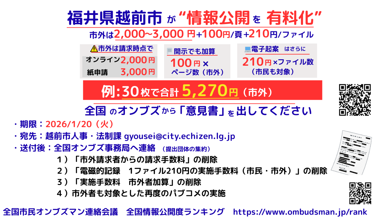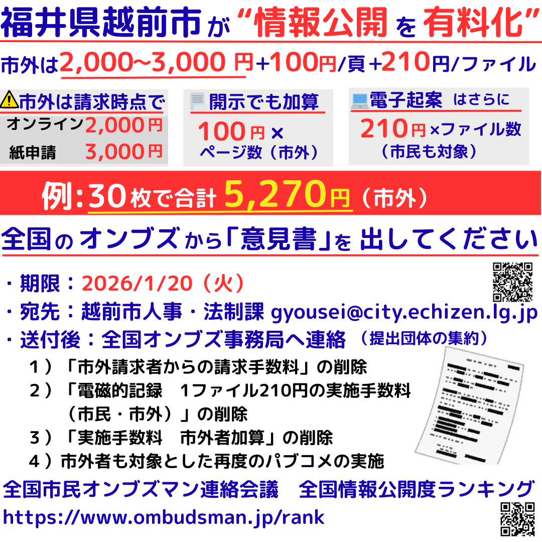 福井県越前市の情報公開請求手数料・実施手数料への意見書提出の呼びかけ