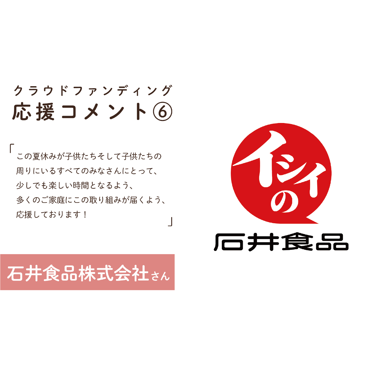 2023-05-29 15:25【応援コメント⑥】クラウドファンディングへの応援コメントをいただきました!おてらおやつクラブではクラウドファンディングの期間中、さまざまな方から応援コメントをいただく予定です。 第6弾の今回は、石井食品株式会社さんからコメントをいただきました。2023-05-29 15:25【応援コメント⑥】クラウドファンディングへの応援コメントをいただきました!おてらおやつクラブではクラウドファンディングの期間中、さまざまな方から応援コメントをいただく予定です。 第6弾の今回は、石井食品株式会社さんからコメントをいただきました。