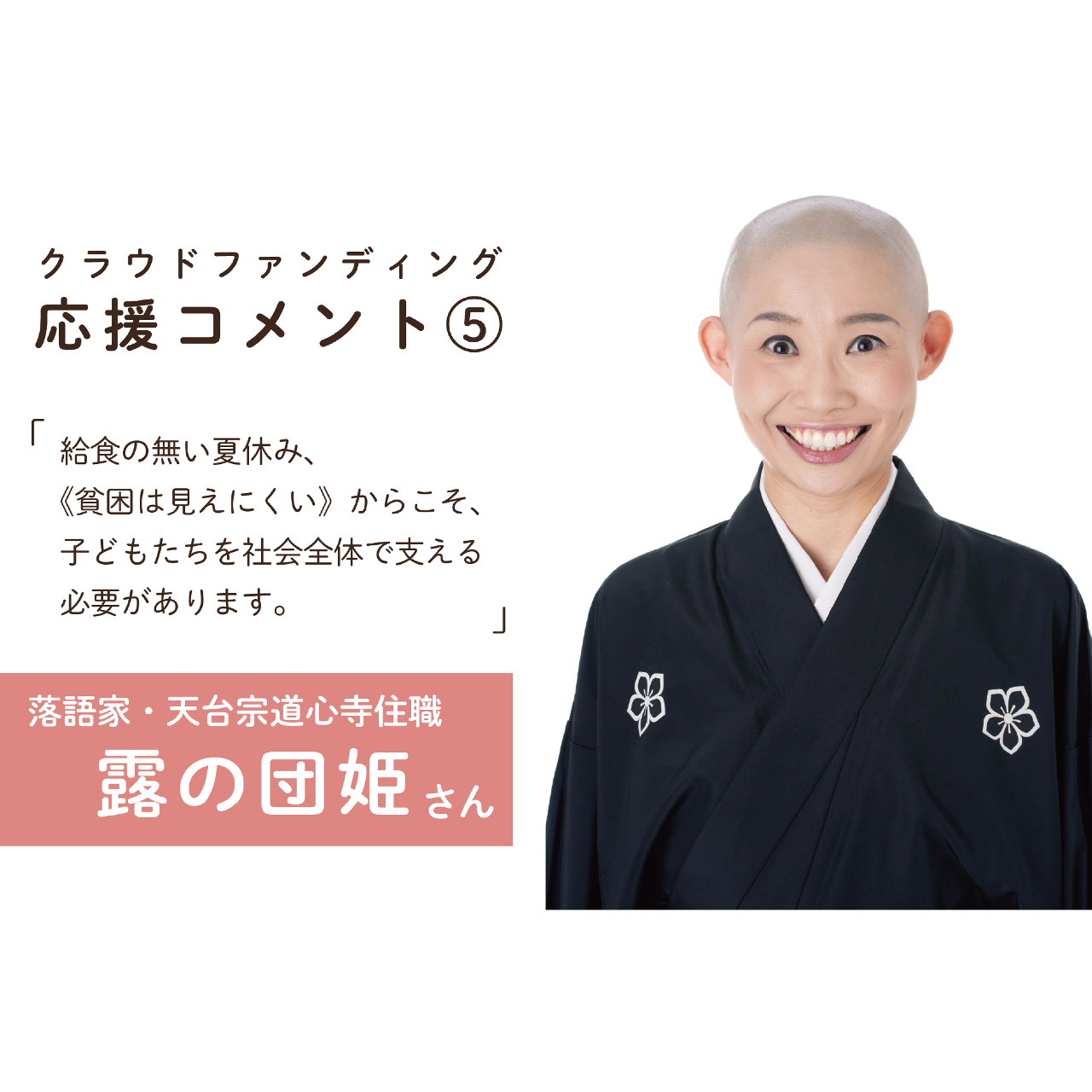 2023-05-25 21:05【応援コメント⑤】クラウドファンディングへの応援コメントをいただきました!おてらおやつクラブではクラウドファンディングの期間中、さまざまな方から応援コメントをいただく予定です。 第5弾の今回は、落語家で天台宗道心寺住職の露の団姫さんからコメントをいただきました。2023-05-25 21:05【応援コメント⑤】クラウドファンディングへの応援コメントをいただきました!おてらおやつクラブではクラウドファンディングの期間中、さまざまな方から応援コメントをいただく予定です。 第5弾の今回は、落語家で天台宗道心寺住職の露の団姫さんからコメントをいただきました。