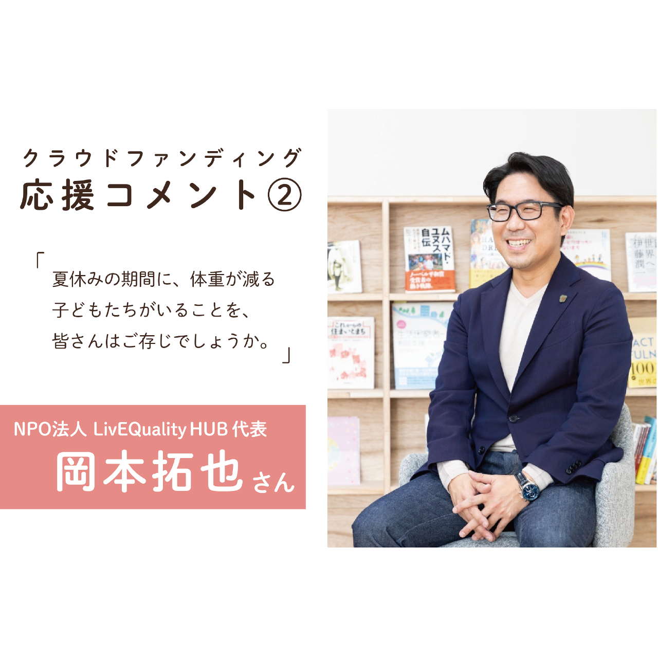 2023-05-13 12:55【応援コメント②】クラウドファンディングへの応援コメントをいただきました!おてらおやつクラブではクラウドファンディングの期間中、さまざまな方から応援コメントをいただく予定です。 第2弾の今回は、NPO法人LivEQuality HUB代表の岡本拓也さんからコメントをいただきました。2023-05-13 12:55【応援コメント②】クラウドファンディングへの応援コメントをいただきました!おてらおやつクラブではクラウドファンディングの期間中、さまざまな方から応援コメントをいただく予定です。 第2弾の今回は、NPO法人LivEQuality HUB代表の岡本拓也さんからコメントをいただきました。