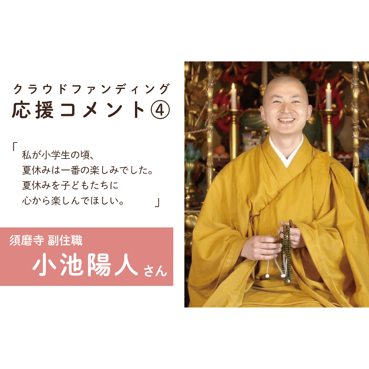 2023-05-23 14:23【応援コメント④】クラウドファンディングへの応援コメントをいただきました!おてらおやつクラブではクラウドファンディングの期間中、さまざまな方から応援コメントをいただく予定です。 第4弾の今回は、須磨寺副住職の小池陽人さんからコメントをいただきました。2023-05-23 14:23【応援コメント④】クラウドファンディングへの応援コメントをいただきました!おてらおやつクラブではクラウドファンディングの期間中、さまざまな方から応援コメントをいただく予定です。 第4弾の今回は、須磨寺副住職の小池陽人さんからコメントをいただきました。