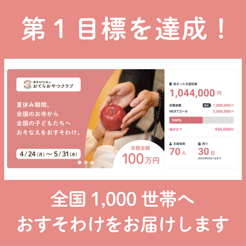 ありがたいことに、70人の方から1,044,000円(104%)の応援をいただき、第1目標を達成しました!