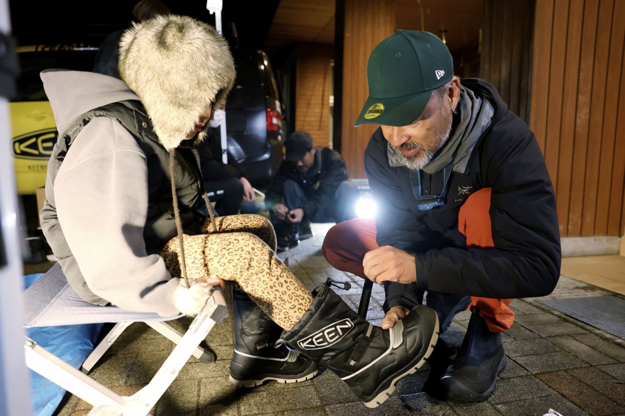 ・24年1月、連携アウトドア企業が能登町の子どもに冬靴500足配布のアテンドを