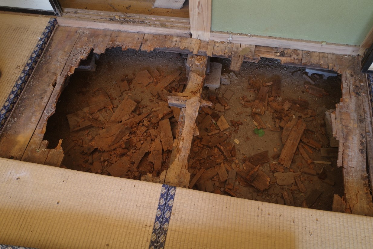 ・築100年以上の古民家、8畳間3部屋続き、全て大引き根太から床の張替えが必要