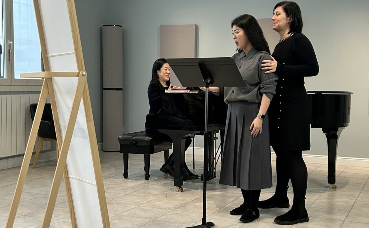 続いて、イタリアを拠点にMaestro accompagnatore(劇場ピアニスト)として幅広く活躍するWei Jiang(ウェイ・ジャン)氏が経営するアカデミーにて研修を行いました。メゾソプラノ歌手のVeronica Simeoni(ヴェローニカ・シメオーニ)氏による情熱的な指導に加え、Wei Jiang氏からはコレペティトールや指揮者の視点を踏まえた音楽づくりを提示いただき、受講生は多角的な視点から多くを学びました。