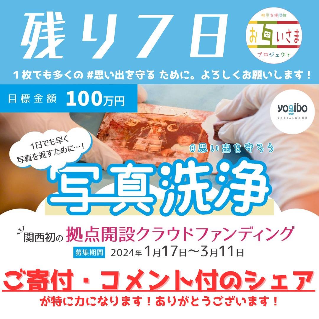 #関西初 #写真洗浄 拠点設立に向けてのクラウドファンディング 、終了まで残り7日となりました。