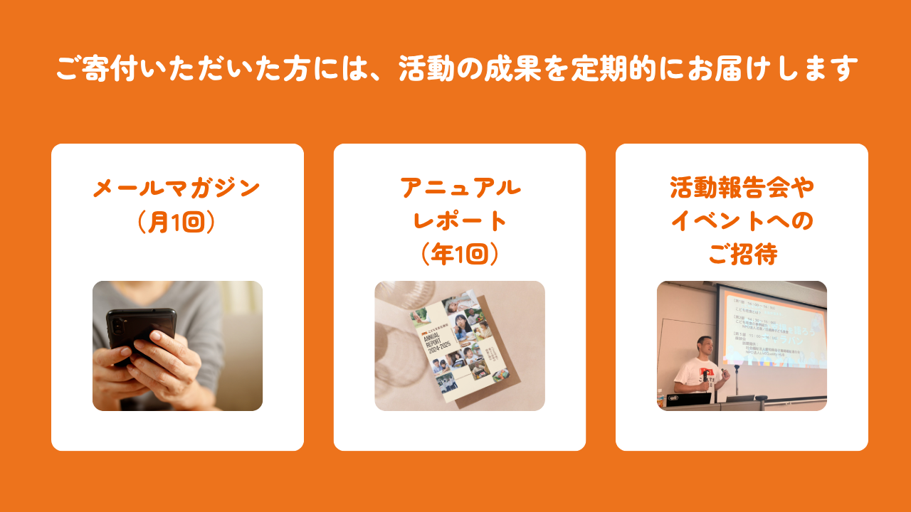 ご寄付いただいた方には、活動の様子を定期的にお届け