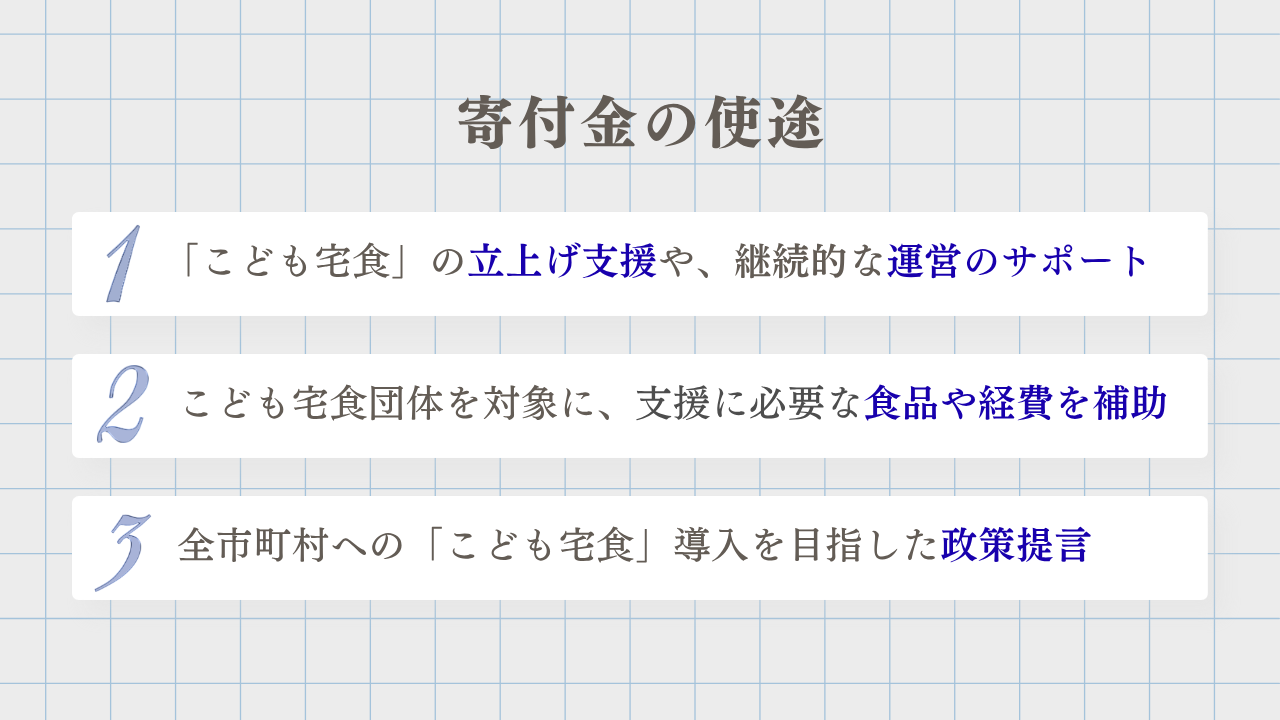 皆さまからのご寄付は、全国各地で活動するこども宅食実施団体への伴走支援や活動基盤づくり、社会全体への発信・政策提言などに活用されます。